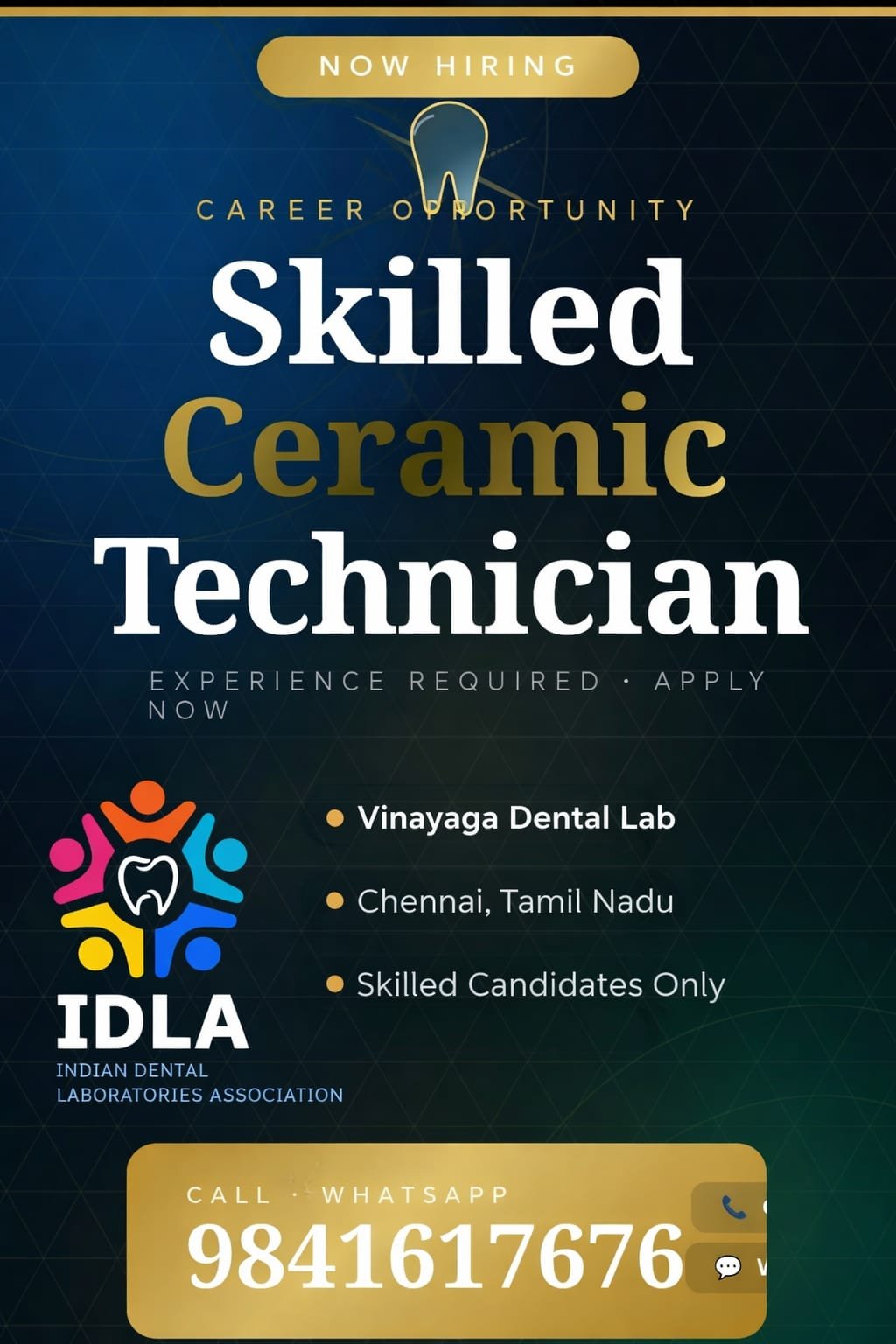 Vinayaga Dental Lab, Chennai is looking for a Skilled Ceramic Technician.